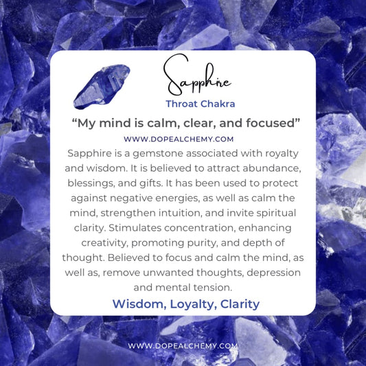 Sapphire is a gemstone associated with royalty. It is believed to attract abundance, blessings, and gifts. It has been used toĀ protect against negative energies, as well as calm the mind, strengthen intuition, and invite spiritual clarity.
